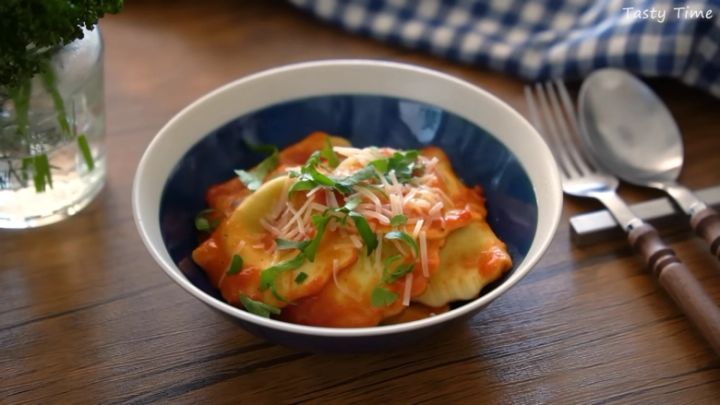 ラビオリの中にはほうれん草とリコッタチーズがたっぷり。もっちりとしたラビオリとまろやかなトマトソースで、本格的なイタリアンを楽しめます。トマトソースにナスやミートボールを加えてアレンジするのもおすすめだそう♪