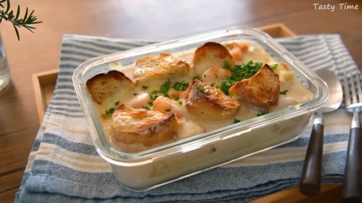 クラムチャウダーが余ったときにはパングラタンを作るのがTastyTimeさんのおすすめだそう。オリーブオイルを入れて温めた鍋で冷凍シーフードと白ワインを加熱し、塩コショウで味つけしたら、クラムチャウダーと牛乳を加えて温めます。耐熱皿にパンを入れ、先ほど作ったソースとチーズを加えてトースターで5~7分加熱するだけ!スープをたっぷりと吸ったパンがたまりません♪