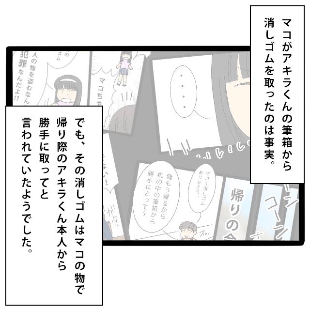 けれど、その消しゴムはマコちゃんがアキラくんに貸していたもので、アキラくんが「筆箱から勝手に取って」と言われていたものでした。