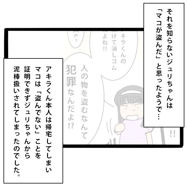 「人のものを盗むなんて犯罪」とジュリちゃんに疑われたので、マコちゃんは「これ私の・・・」と言ったのですが、ジュリちゃんは聞き耳を持ちません。それに、アキラくんは既に帰宅してしまったので確認できず、事の経緯を証明することができなかったのです。