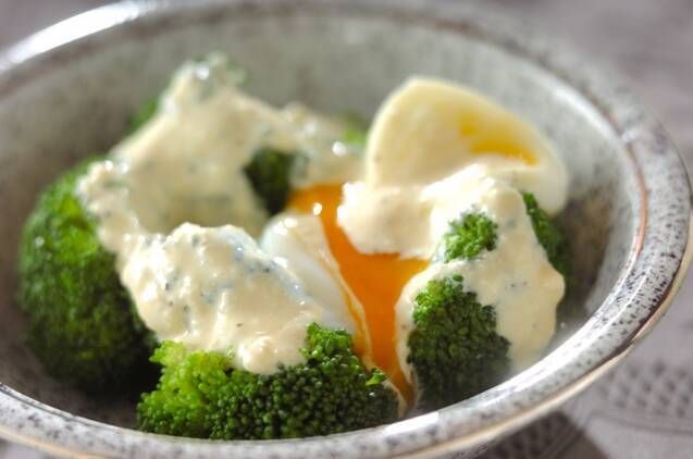 ニンニクが効いたチーズの入ったコクのあるドレッシングをブロッコリーとゆで卵にかけた食べ応えのある温かいサラダです。魚介類とトマトの酸味によく合います。冷凍ブロッコリーを使えばさらに時短で作れますね。
