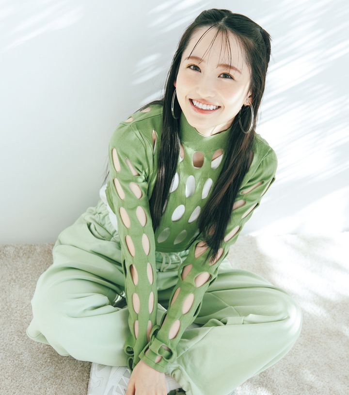 一ノ瀬美空(乃木坂46)。ar3月号より ニット¥19,800、タンクトップ¥9,900/ジョゼムーン パンツ¥18,593/Rest&Recreation(ムシンサ グローバル ストア) スニーカー¥26,400/サロモン(サロモン コールセンター) イヤリング¥4,290/アジンコ(ロードス) ソックス/スタイリスト私物