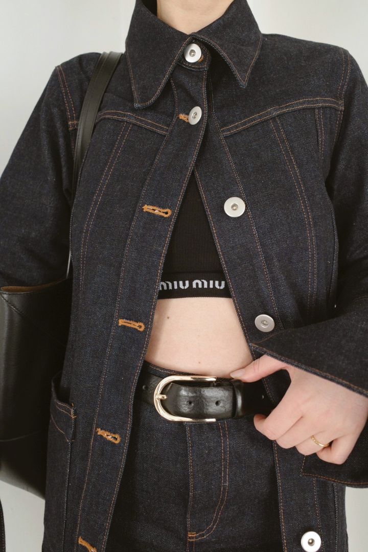「春先はお腹も出していきたくて、ミュウミュウのブラレットを合わせています。だらしなくならないよう、締めるところは締めてバランスを。深いインディゴカラーのデニムはキレイめにも着られてオススメです」デニムジャケット¥30,800、デニムスカート¥21,780(共にロザリー/ロザリームーン)