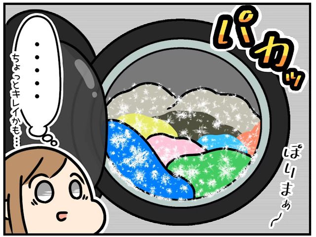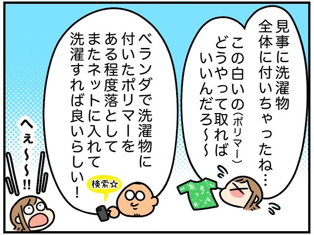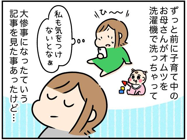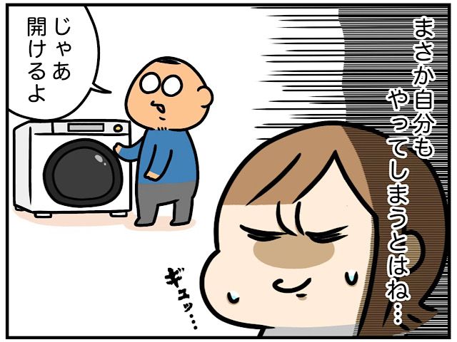 洗濯物を干しに行ったご主人から「洗濯物の中にオムツ入ってたみたい・・・」と知らされ、いつ洗濯物の中にオムツが紛れたのか数時間前の記憶を辿るなでこさん。すると、てんちゃんをお風呂に入れてくれたお義母さんに「服脱ぎっぱなしで置いといていい?」と聞かれ「大丈夫です!」と答えてよく確認せずにてんちゃんの服を洗濯機に入れたことを思い出し・・・犯人は自分だと落ち込むなでこさん。恐る恐る洗濯機の中を確認しに行きます・・・。