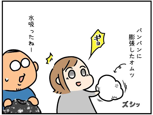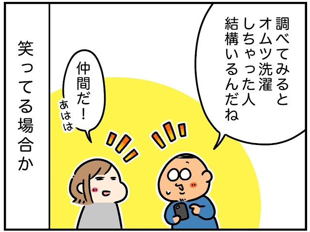 [3]笑ってる場合じゃなかった。仲間の存在に和む夫婦を待ち受けるさらなる悲劇・・。オムツを洗濯してしまった話|なでこの育児漫画