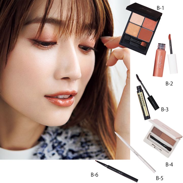 B-1 肌に馴染みやすい王道カッパーブラウン。& be パレットアイシャドウ カッパーブラウン¥3,300(Clue) B-2 目以外にもマルチに使えるリキッドカラー。リキッドアイ&フェイスカラー 03 ¥3,520(ナチュラグラッセ) B-3 ボリュームを出しながらセパレート感のあるまつ毛に。セザンヌ ボリュームラッシュマスカラ ¥638(セザンヌ化粧品) B-4 2色のブレンドで自然な立体感のある眉に。アイブロウパウダー 02 ¥3,520(ネイチャーズウェイ) B-5 やわらかな描き心地。アイブロウペンシル 02 ¥3,080(ネイチャーズウェイ) B-6 締め色にも、ライン使いにもマルチに使えるピンクブラウン。MiMC ミネラルスマッジアイライナー 04 ¥3,300(MIMC)