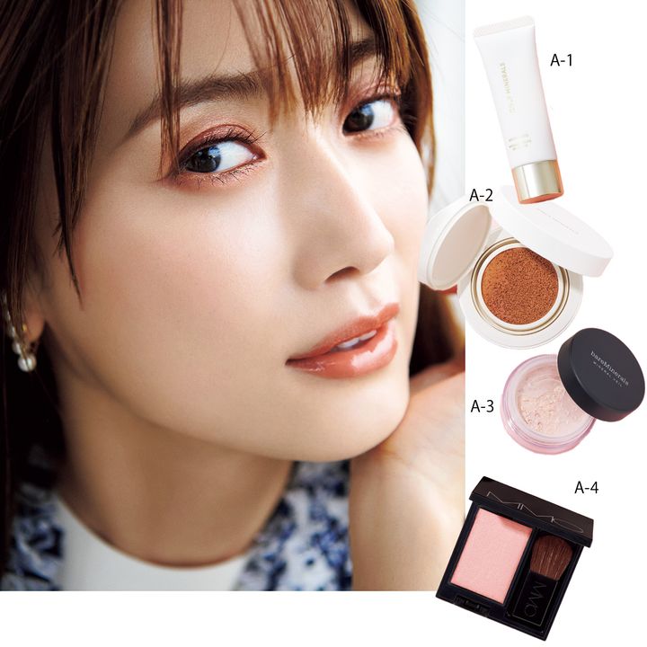 A-1 シワ改善と美白を同時に叶え、リッチなツヤ肌へ。オンリーミネラル 薬用 リンクルホワイト BB クリーム ライトオークル SPF25/PA++[医薬部外品]25g ¥4,950(ヤーマン) A-2 気になる部分を薄膜でカバーし、セミツヤ仕上げ。オンリーミネラル 薬用 リンクルホワイト クッションBB ライトオークル SPF25/PA++[医薬部外品]11g ¥5,720 ※セット価格(ヤーマン) A-3 化粧崩れを防ぎ、毛穴レスでシアーな素肌感を演出。ベアミネラル ミネラルベール L 9g ¥4,620(ベアミネラル) A-4 抜け感のあるローズピンク。MiMC ミネラルスムースチーク 06 ¥4,400(MIMC)