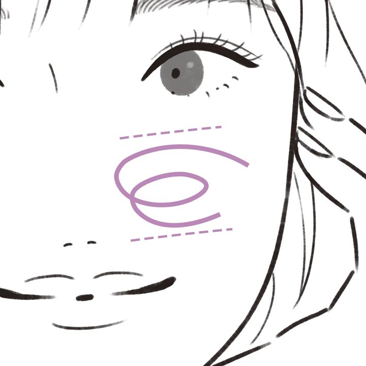 パーツ間を繋ぎ、余白を消すパウダーチークはたつまき型に。起点は鼻の中ほど、横長にグルグルを描き、小鼻の下ラインで止めます。
