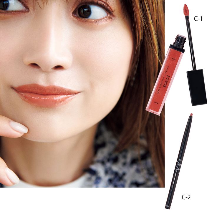 C-1 コーラルベージュで唇に少し血色感をプラス。ミネラルリッププランパー ディープ キャロットピーチ ※限定色¥3,300(エトヴォス) C-2 ナチュラル100%成分。MiMC ミネラルリップライナー ※一部店舗限定¥3,080(MIMC)