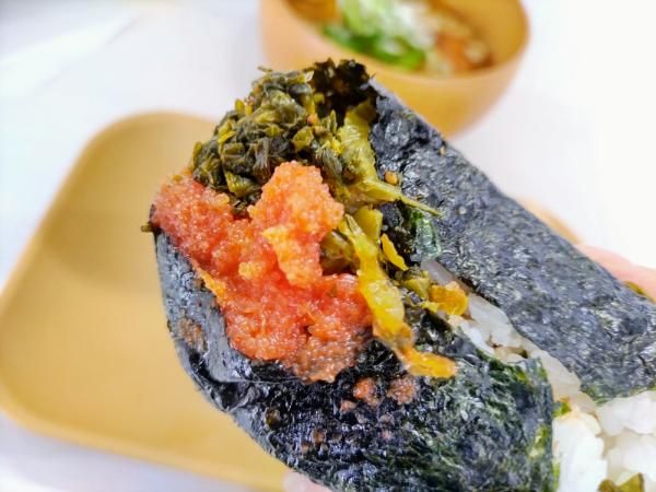 旨い!ほかほかのご飯には、やはり明太子がたまりません!高菜のピリ辛も加わり、ご飯が進みます!おむすびの具材にぴったりな味わいで、無限に食べられそう!おむすびって、シンプルだけど日本人にとって究極のごちそうですよね。食べていて幸せ♪