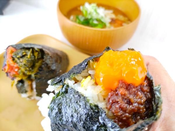 今回は、明太子に高菜、卵黄に肉そぼろをトッピングし、おむすびのお供に豚汁を注文してみることに。さて、トッピングすることでどんな味わいが楽しめるのか、いざ、実食!