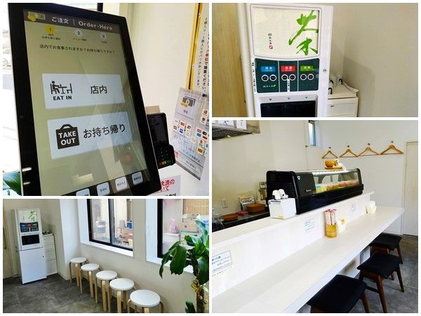 店内は、白を基調とした明るく清潔感のある空間。L字型カウンターには7席、テイクアウト待ち用の丸椅子が5席設置されています。注文と会計はタッチパネルで、厨房へデータが送信されるシステム。お茶やお水は、セルフサービスとなっています。