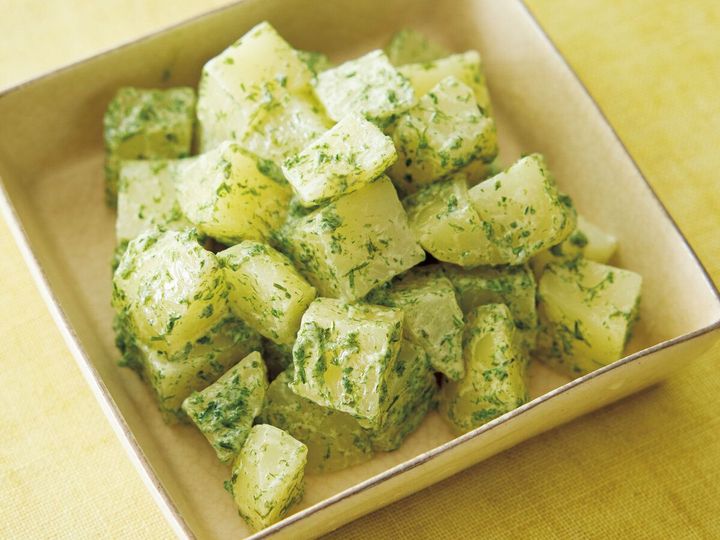 じゃがいもは皮をむいて2cm角に切り、さっと水にさらして水けをきる。耐熱のボールに入れ、ふんわりとラップをかけて電子レンジ(600W)で5分加熱し、粗熱を取る。