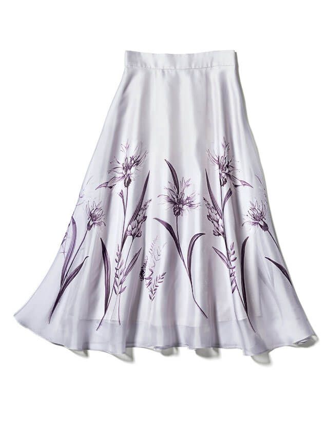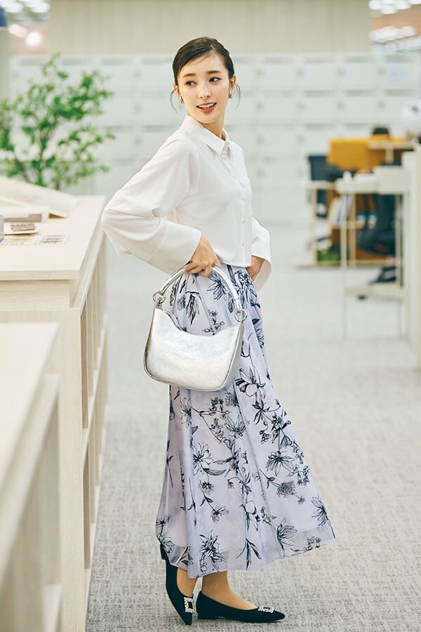 ほどよいシアー感のフレアスカートと、繊細な花柄のコンビネーションがオフィスに必要な品格とマッチ。