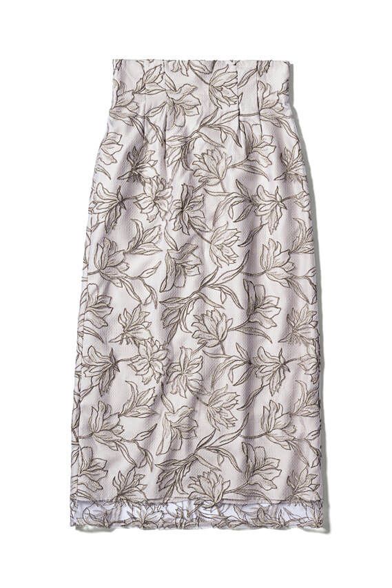 オリジナル刺しゅうを施した上品なタイトシルエット。甘さを抑えた花のレースがエレガント♪