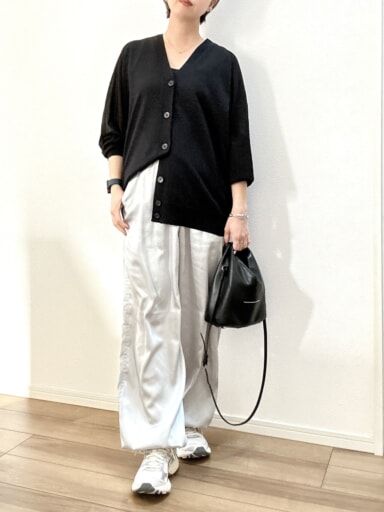 身体が泳ぐゆとりあるシルエットなので、中にTにシャツやカットソーのレイヤードがしやすいですし、黒でも袖の透け感が軽やかなので、これからの季節にも重たくならずに着こなせるのも魅力。ジャケットと同じくらい洗練さを醸しながら、ノンストレスでベーシックをアップデートできます。