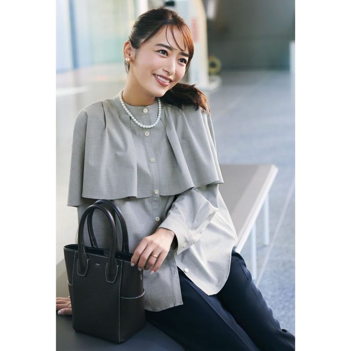 定番の黒パンツに合わせる 甘ブラウスはケープ調デザインで フォーマル感をプラス。