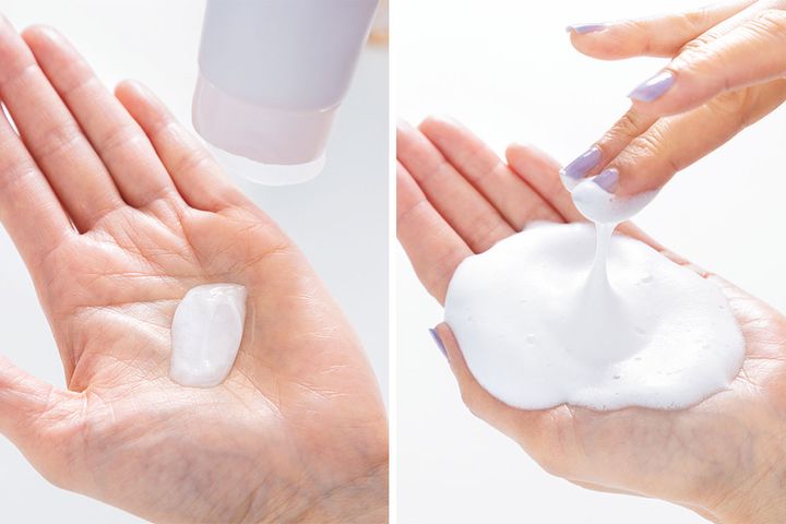 洗顔料の規定量を守り、水を混ぜてしっかり泡立てることが重要。泡がのびるくらいは泡立てましょう。