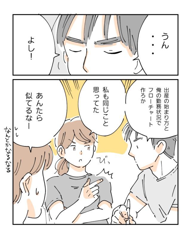 「出産の始まり方と俺の勤務状況でフローチャート作ろか」