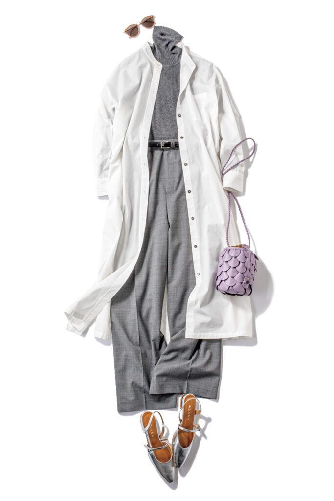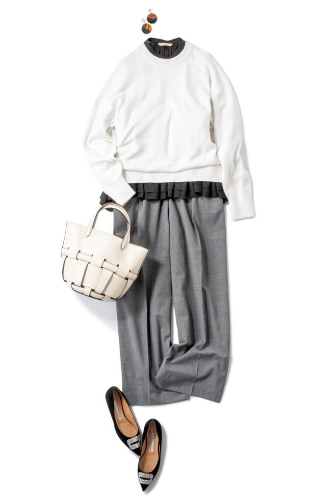 白黒の服をなじませてくれるグレーで投入。ストレートシルエットのワイドパンツはスタイルアップを叶えてきちんと見えも担保。¥22,000(プラージュ/プラージュ代官山店)