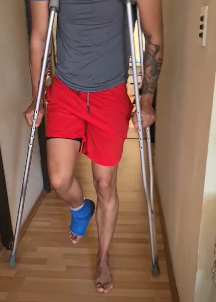 松葉杖をついて廊下を移動する男性。 怪我しているようで、片足を浮かせたまま歩いています。