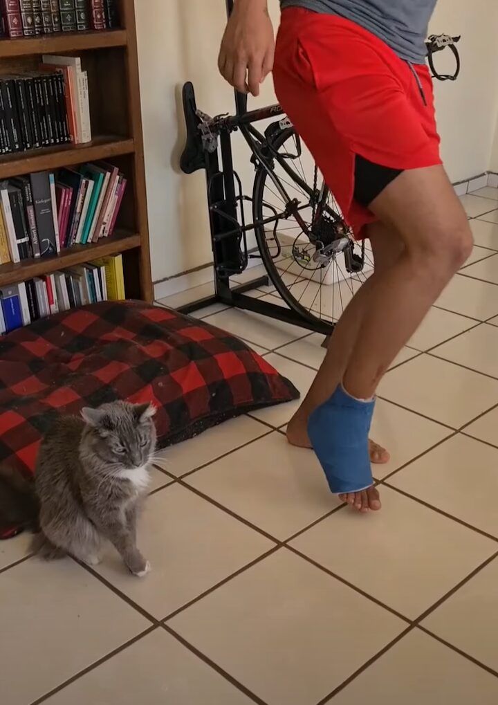 飼い主さんのまねっこをする猫がかわいすぎる。松葉杖で移動する男性の後ろをピョコピョコ・・おててを上げて歩いてる!!