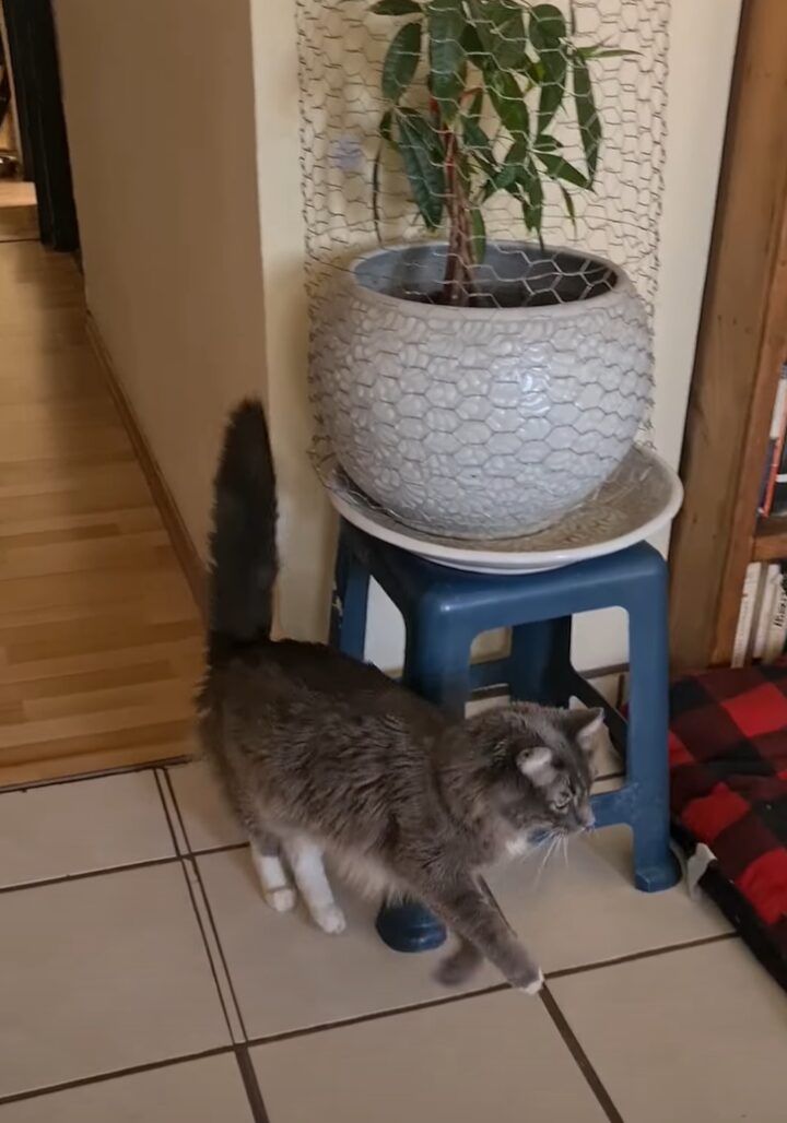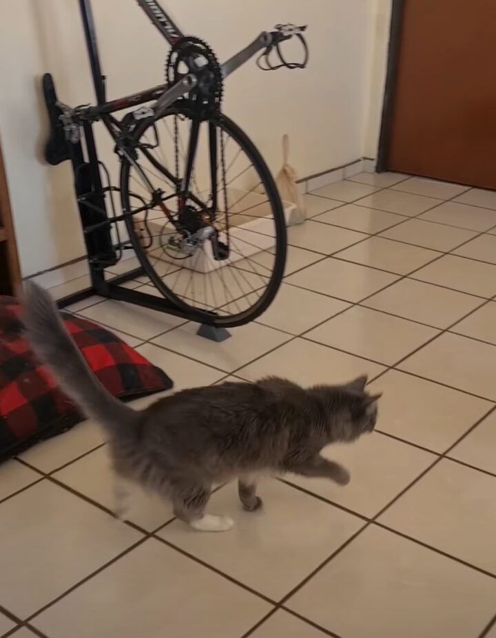 飼い主さんの真似をして足を浮かせて歩く猫。 その様子は、こちらの動画からご覧いただけます。