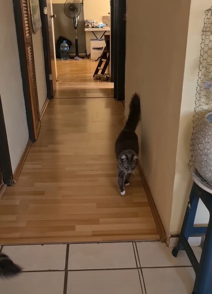 3. 飼い主さんのまねっこをする猫がかわいすぎる。松葉杖で移動する男性の後ろをピョコピョコ・・おててを上げて歩いてる!!