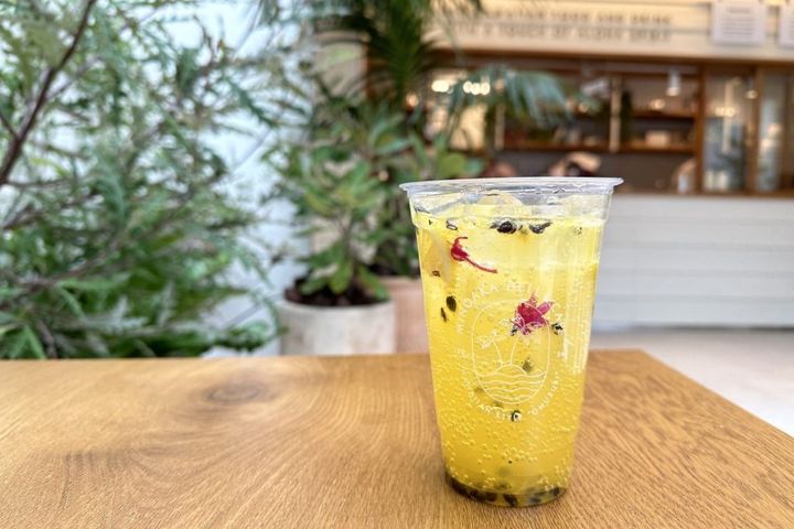 炭酸好きの私は、「リリコイソーダ」をチョイス。リリコイとはパッションフルーツのこと。甘酸っぱいリリコイにレモンがたっぷり入って、とてもさわやか。リフレッシュできるので、疲れた日や夏にぴったりです。