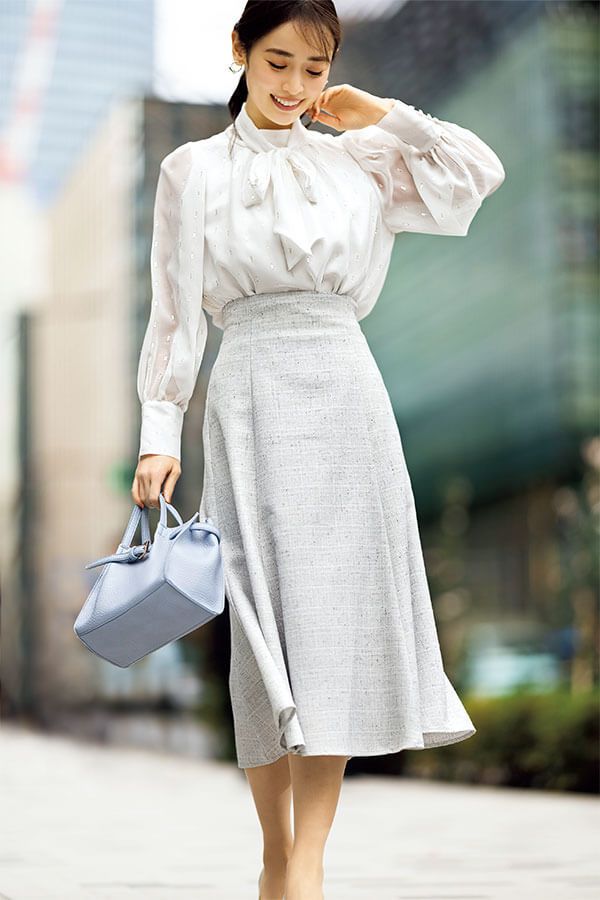 旬のシアー素材を、クリーンな白ブラウスで。ボウタイと袖口のクラシカルな風情がきちんと感を高め、控えめな柄あしらいがシャレ見えを促すポイントに。