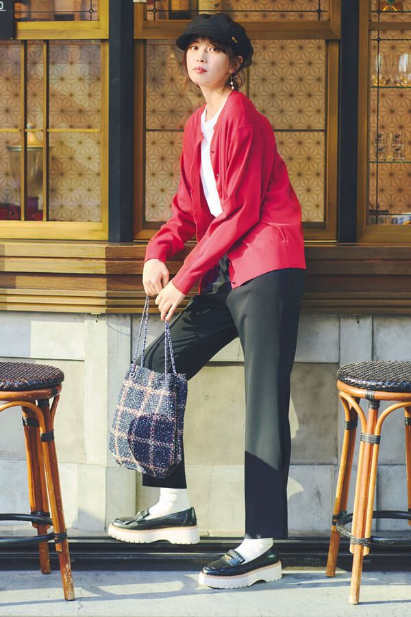 パンツ¥18,700/ルーニィ カーディガン¥14,300/カデュネ Tシャツ¥9,790/TICCA バッグ¥8,250/カカトゥ(アンビリオン) キャスケット¥11,880/カシラ(CA4LA) ソックス¥1,210/.fukuske(福助) イヤリング¥6,050/フェリーチェ(ロードス) ローファー¥47, 300/ケイト・スペードニューヨーク(ケイト・スペード カスタマーサービス)