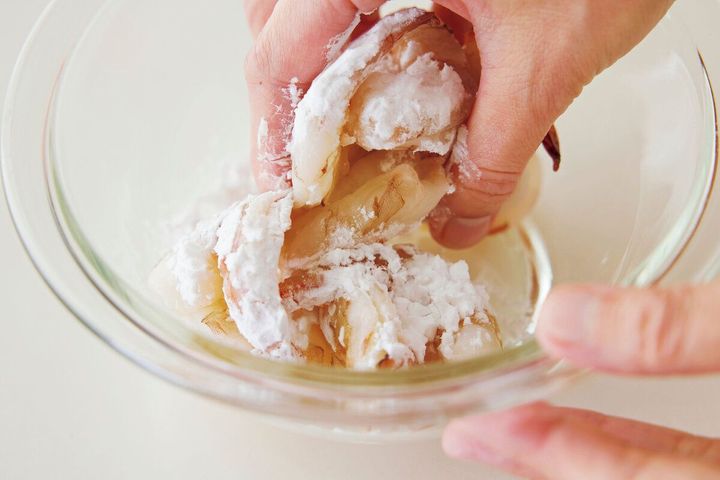 (1)えびは背に縦に1本切り目を入れて開き、背わたがあれば取って、片栗粉適宜をふってもむ。さっと洗って水けを拭き、塩、こしょう各少々をふる。