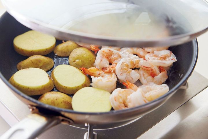 大きめのボールにえびを取り出し、じゃがいもの上下を返して再びふたをし、3~4分焼く。えびのボールにじゃがいも、(1)の玉ねぎ、〈A〉を加えてあえる。