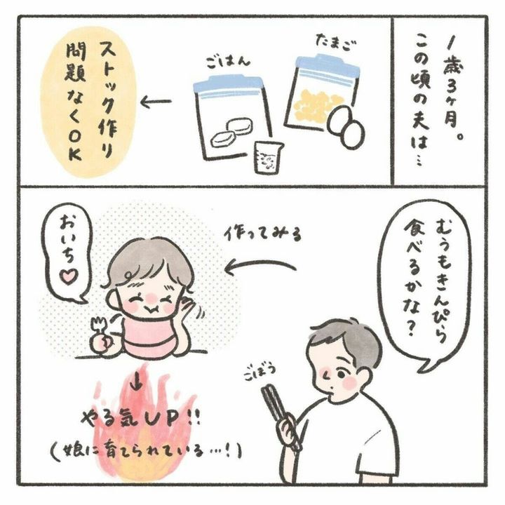 離乳食を作ったり、寝かしつけに挑戦してみたりと、夫のできることが増えます。