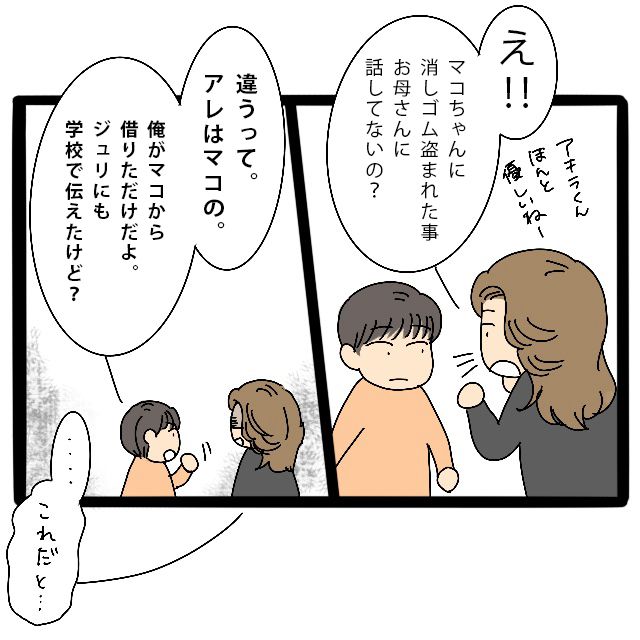 するとジュリちゃんママは、アキラ君がマコちゃんに消しゴムを盗まれた事件をお母さんに話していないことに驚いた様子。