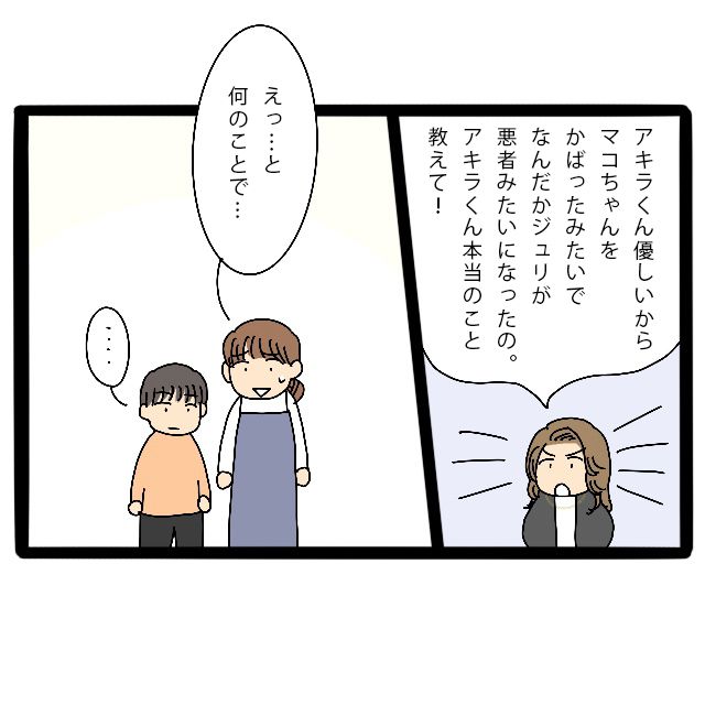 ジュリちゃんママの要件は、優しいアキラ君がマコちゃんをかばったせいでジュリちゃんが悪者になってしまったので、アキラ君に本当のことを教えてほしい、ということでした。