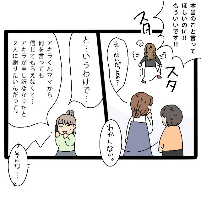 何を言ってもジュリちゃんママが信じてくれないので、アキラ君ママは申し訳なかったという気持ちになり、マコちゃんとマコちゃんママに謝りたいという伝言を直ちゃんママに託したのでした。