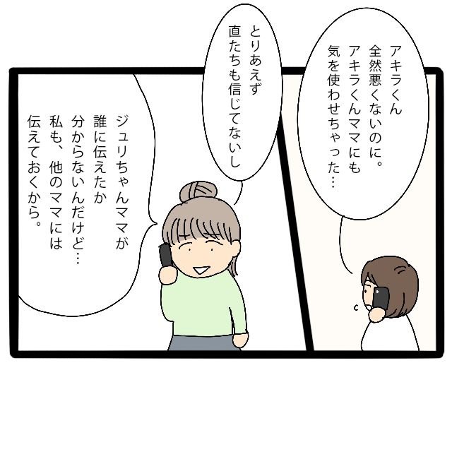 直ちゃんママは、マコちゃんのことを知っている人は盗みなんて信じていないし、ジュリちゃんママが誰に言いふらしているのかは分からなくても他のママに伝えておくとフォローしてくれました。