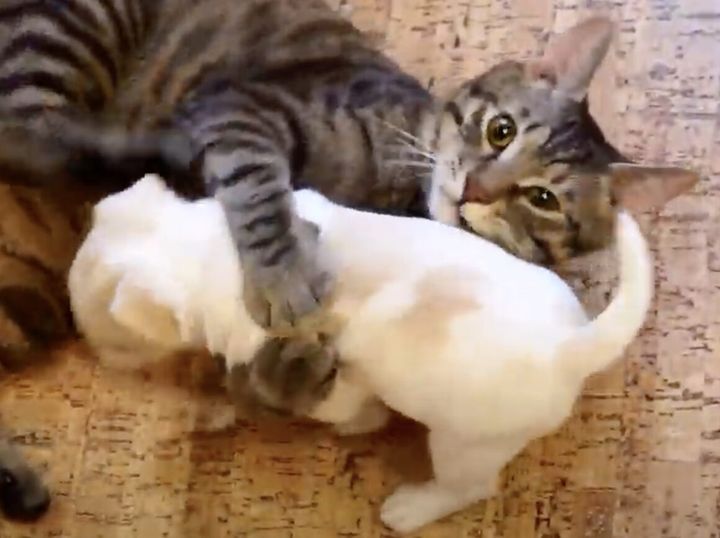 3. 大人げないよ〜! 子犬相手に本気でプロレスする猫。