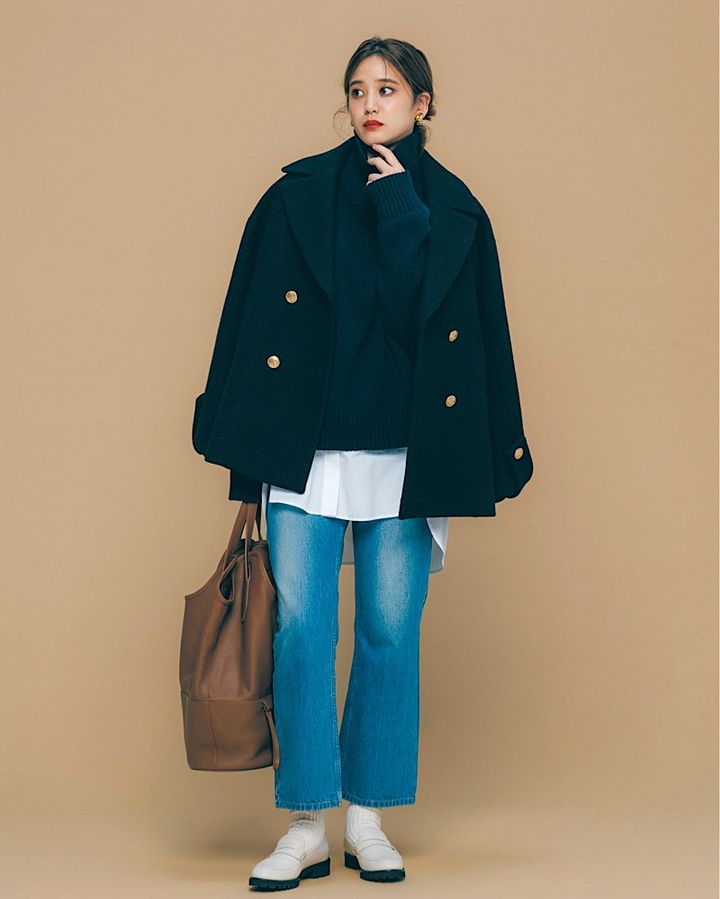 重量感がでがちな黒コートとタートルネックは、どこかに“抜け”をつくるとあか抜けます。ブルーデニムの間に白シャツを覗かせ、爽やかなアクセントを効かせるのがコツ。黒ブーツではなく、白ソックス×白ローファーで足元を軽やかに更新。