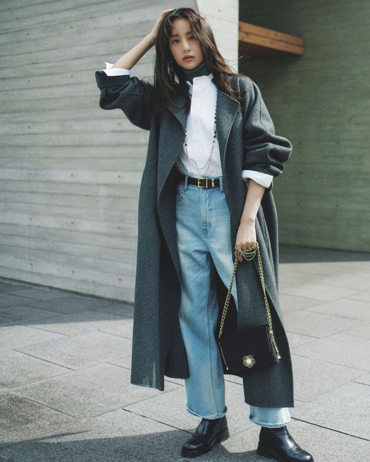 ルーズに見えがちなワイドストレートデニムは、小物次第でレディな雰囲気へ更新。バッグ、ネックレス、ベルトの細部にゴールドを散りばめることで、リュクスな華やぎが加わります。ざっくりとした着流しのグレーコートを羽織っても、どこか品行方正なムード。