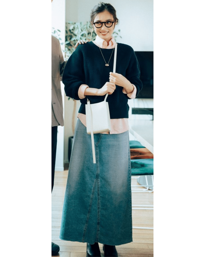 春らしいピンクシャツは、ネイビーニットで凛とした大人顔に落とし込むのがおすすめです。襟や裾から少し覗くくらいが、程よい甘さで◎。自然なAラインのロングデニムスカートが、親しみやすさと女性らしさを兼備した着こなしに導きます。