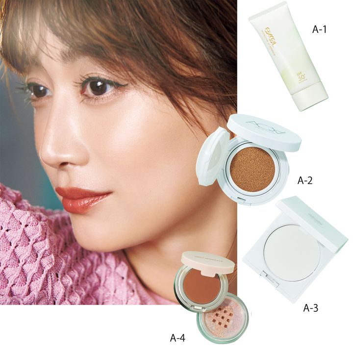 A-1 美容液のように軽いつけ心地でサラサラ肌へ。エクセル プロテクティブ UV エッセンス 60g ¥1,540(常盤薬品工業) A-2 これ1つで毛穴レスなツヤ肌が完成します。アクア・アクア オーガニッククッションコンパクトリフィル¥3,080 ケース¥935(RED) A-3 天然由来成分100%配合。メイク落とし不要のフェイスパウダー。ソソ オールデイパウダー 10g ¥3,740(Nuzzle) A-4 パールとクリーム、質感で立体感と透明感を叶えるマルチカラー。オンリーミネラル ミネラルカラーズ アイシャドウ デュオ 01 ¥3,740(ヤーマン)