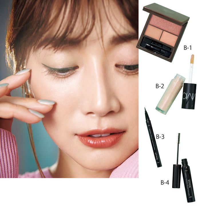 B-1 眉だけではなく、アイシャドウとしても。甘いニュアンスのピンクベージュ。フーミー マルチアイブロウパウダー ブーケットブラウン ¥1,980(Nuzzle) B-2 オレンジゴールドの偏光パールでヘルシーな透明感あふれる澄んだ目元へ。MiMC ミネラルリキッドリーシャドー 10 ¥3,630(MIMC) B-3 深みの中にも透明感のあるスモーキーグリーン。エトヴォス ミネラルスムースリキッドアイライナー リーフグリーン※限定色¥2,970(エトヴォス) B-4 極細ブラシが産毛までをキャッチ。聡明で凛としたグリーン。ミネラルニュアンスカラーマスカラ モスグリーン※限定色¥2,970(エトヴォス)