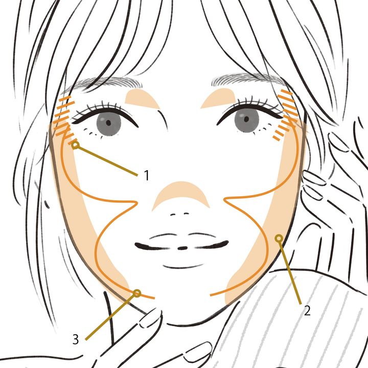 クリームタイプのフェイスカラーを、チーク兼シェーディングとしてこめかみから頰下、顎下まで3を描くように塗ります。