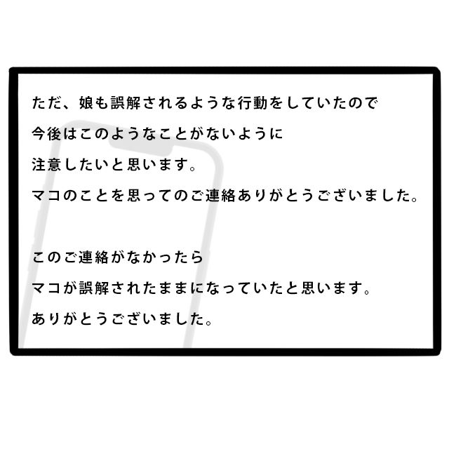 ただ、誤解されるような行為であったことは親として指導することや、ジュリちゃんママからメールをもらわなければ、マコちゃんは誤解されたままだったので連絡してくれたことへの感謝も綴りました。