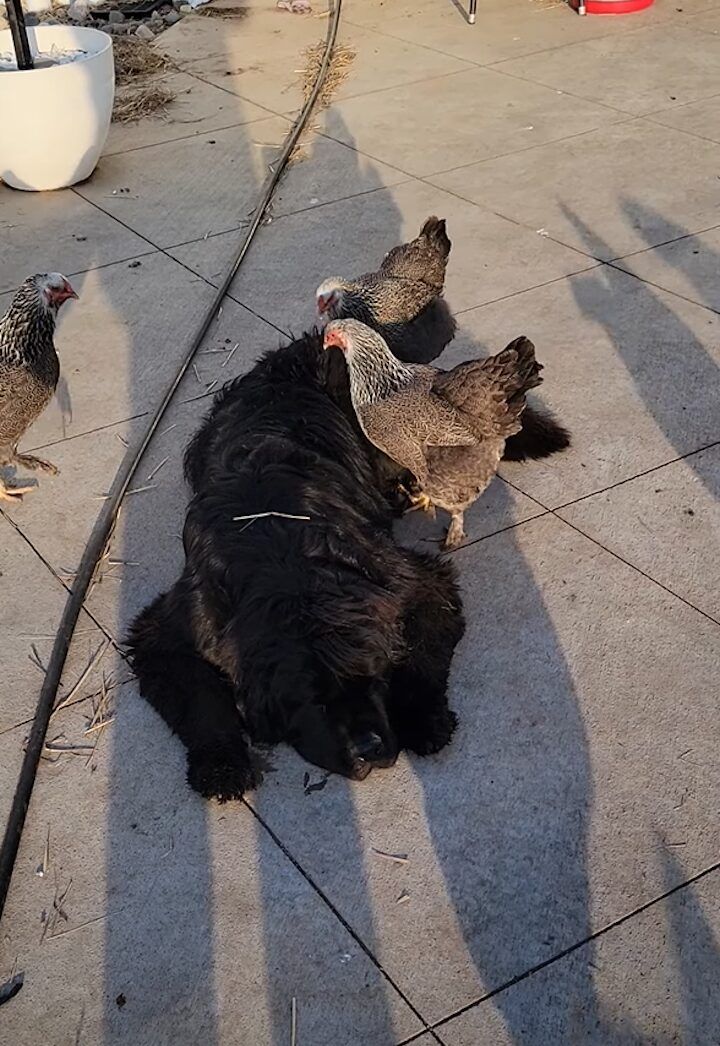 しかし、ケビンがニワトリたちを怒ることなく、お昼寝の体勢に戻ります。 そんなケビンの背中に、1羽のニワトリが飛び乗ってみせました。