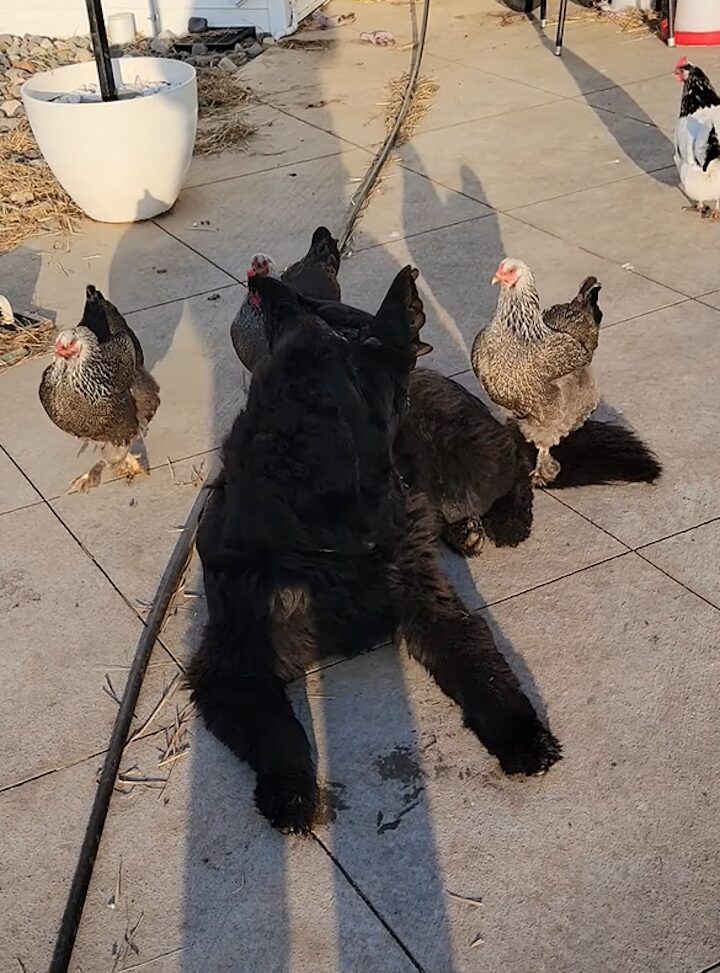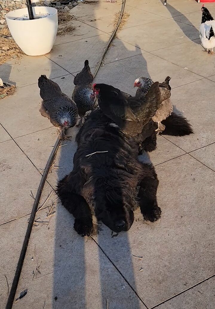ニワトリたちにお昼寝を妨害される犬たち。 その様子は、こちらの動画からご覧いただけます。