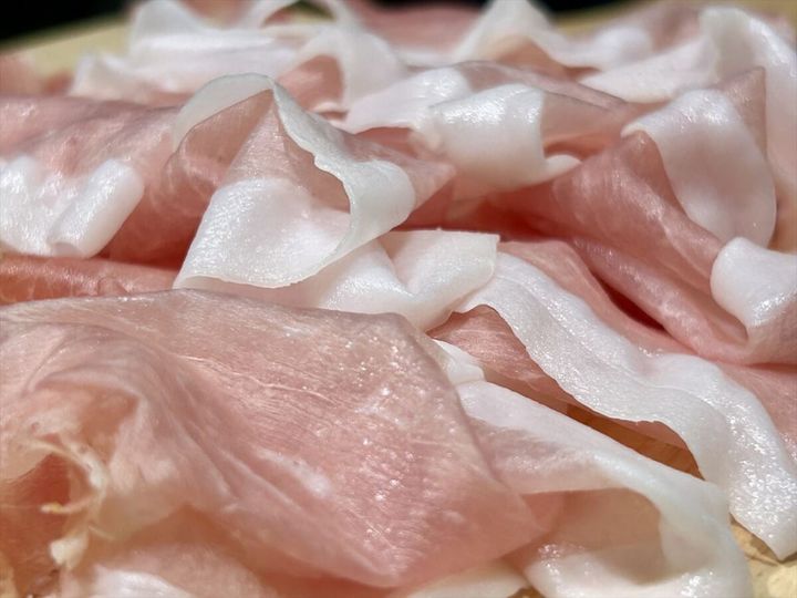 白豚の後ろ脚を使用した、ハモン・セラーノは、スペイン産の生ハムです。コクのある味わいで、噛むほどに旨みが滲みだします!