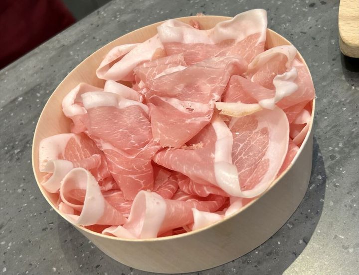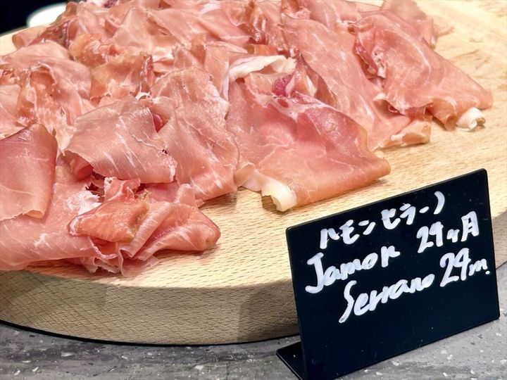 生ハムは注文にあわせて店頭でスライスしてもらえます。サイズは、ピッコロ、メディオ、グランデの3種から選択可能です。